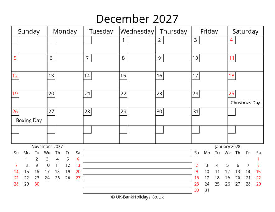 Your are downloading Printable Monthly Uk Calendar December 2027 from website UK Bank Holidays. Please select a format (.docx or pdf) you like to download and print!