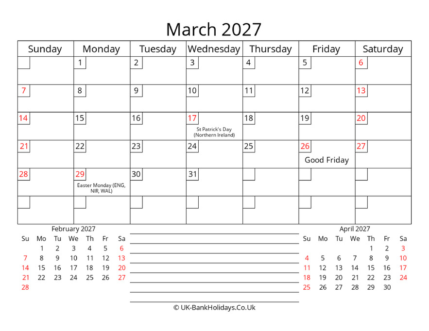 Your are downloading Printable Monthly Uk Calendar March 2027 from website UK Bank Holidays. Please select a format (.docx or pdf) you like to download and print!