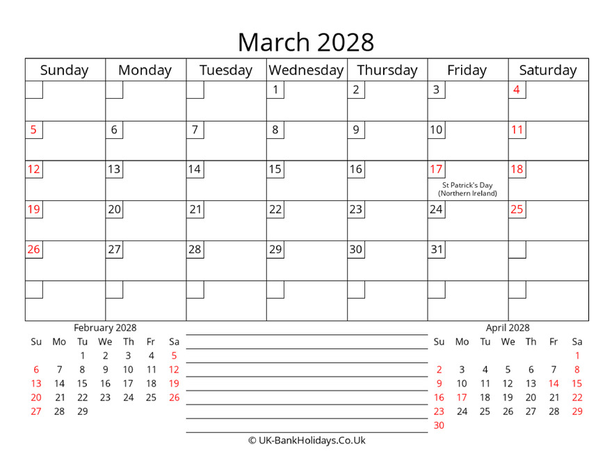 Download Printable Monthly Uk Calendar March 2028