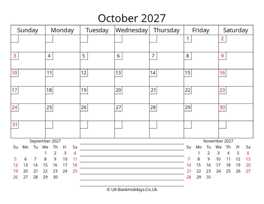 Your are downloading Printable Monthly Uk Calendar October 2027 from website UK Bank Holidays. Please select a format (.docx or pdf) you like to download and print!