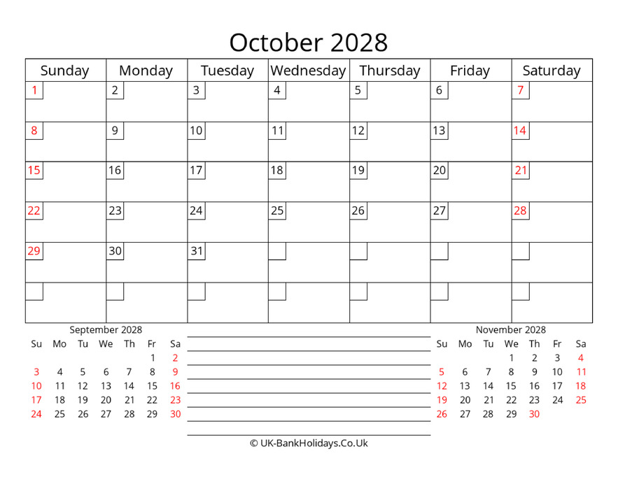 Download Printable Monthly Uk Calendar October 2028