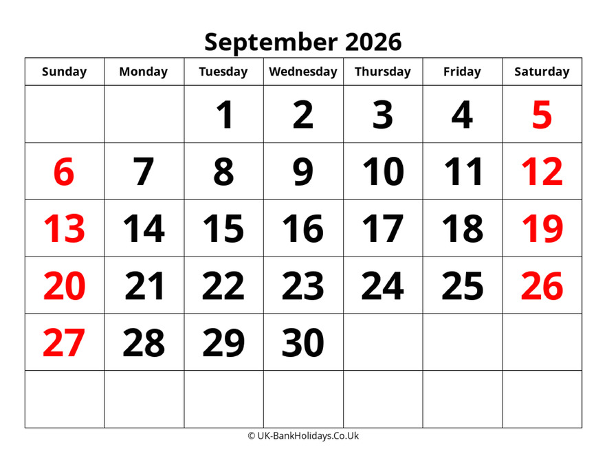 Your are downloading September 2026 Pdf Uk Calendar from website UK Bank Holidays. Please select a format (.docx or pdf) you like to download and print!
