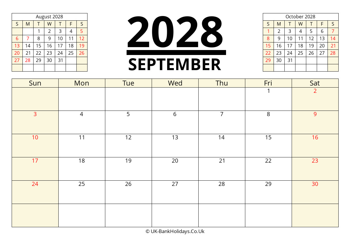 Your are downloading September 2028 Printable Uk Calendar from website UK Bank Holidays. Please select a format (.docx or pdf) you like to download and print!