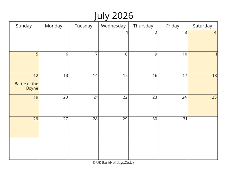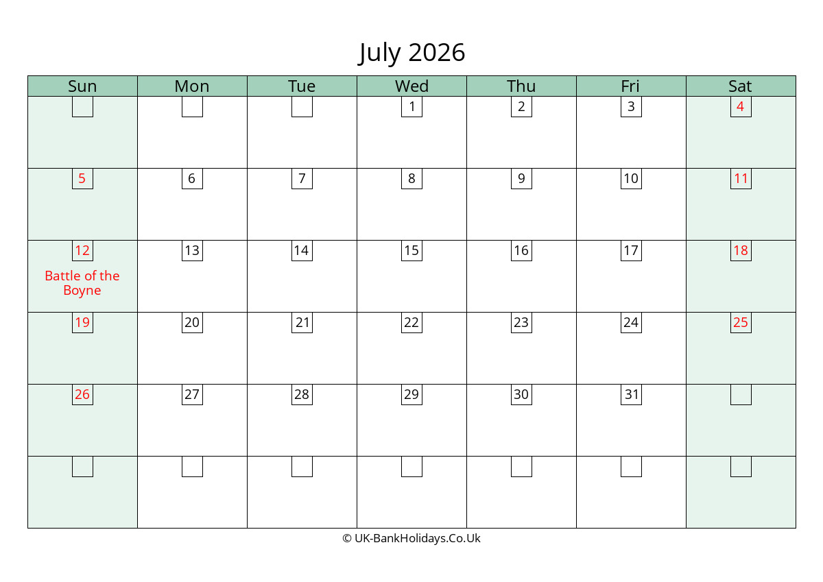 This is July 2026 Calendar Printable with Bank Holidays UK. This monthly calendar come with two version: PDF and PNG. Check the review and download to print your July Calendar now!