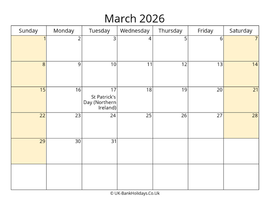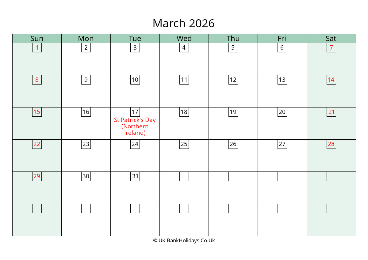 This is March 2026 Calendar Printable with Bank Holidays UK. This monthly calendar come with two version: PDF and PNG. Check the review and download to print your March Calendar now!